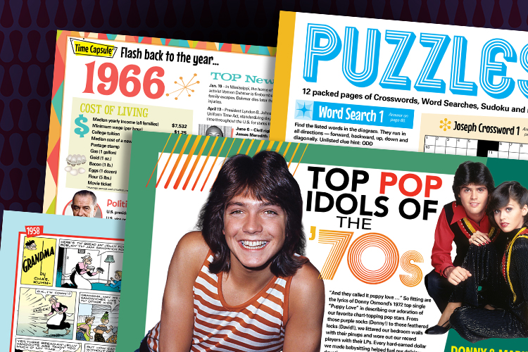 ReMIND magazine is a celebration of nostalgia with vintage photos and pop culture stories from days gone. Each issue offers fresh takes on popular TV shows, movies, music and personalities. Rounding out each jam-packed issue of ReMIND are dozens of brain-teasing puzzles, crosswords, trivia, quizzes and classic comics, providing a great way for mature readers to stay sharp — and a new generation to delight in the past.